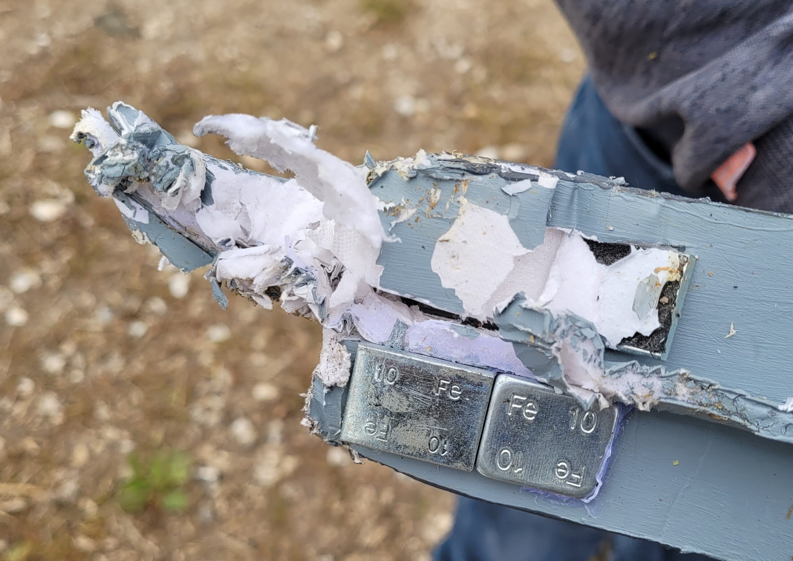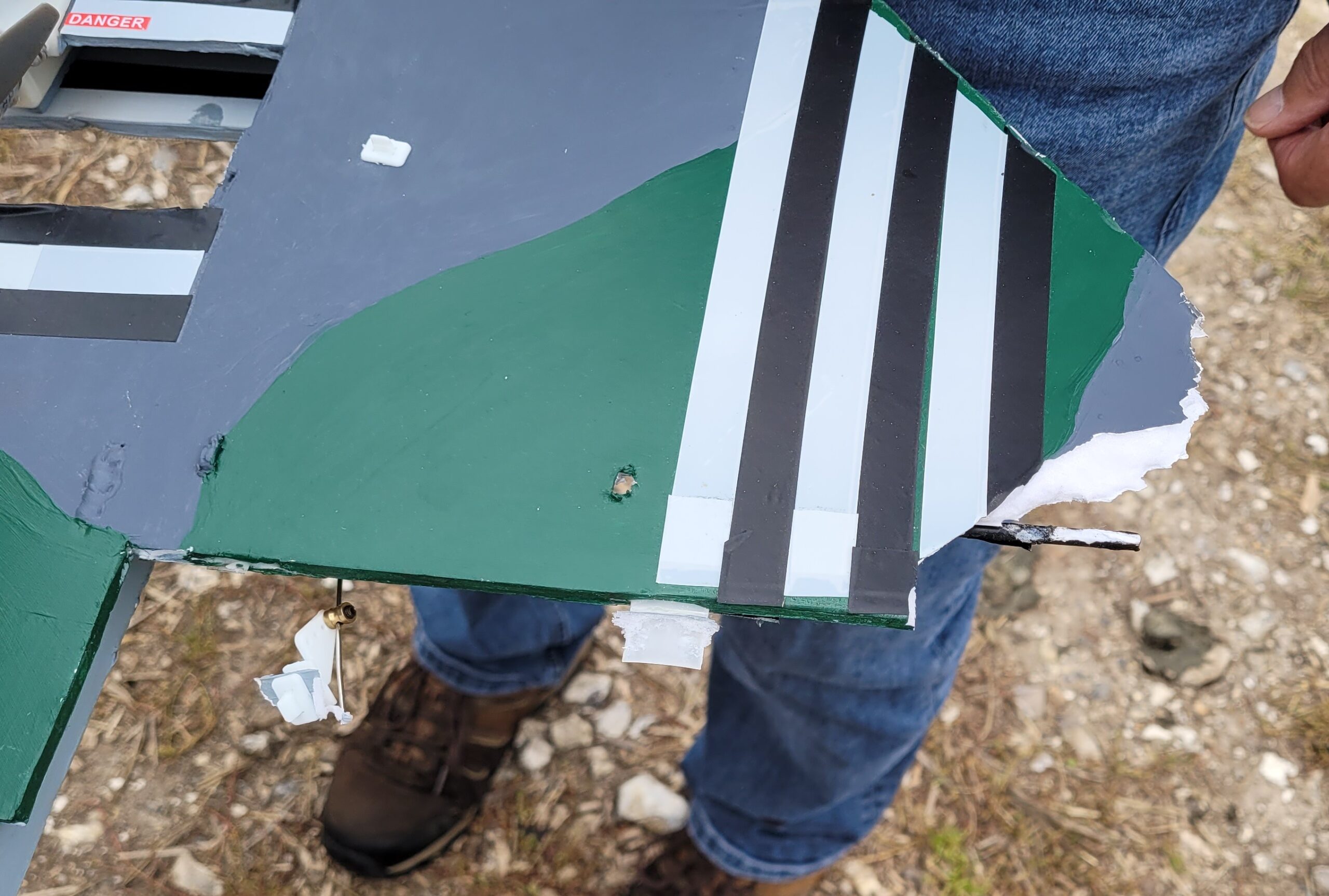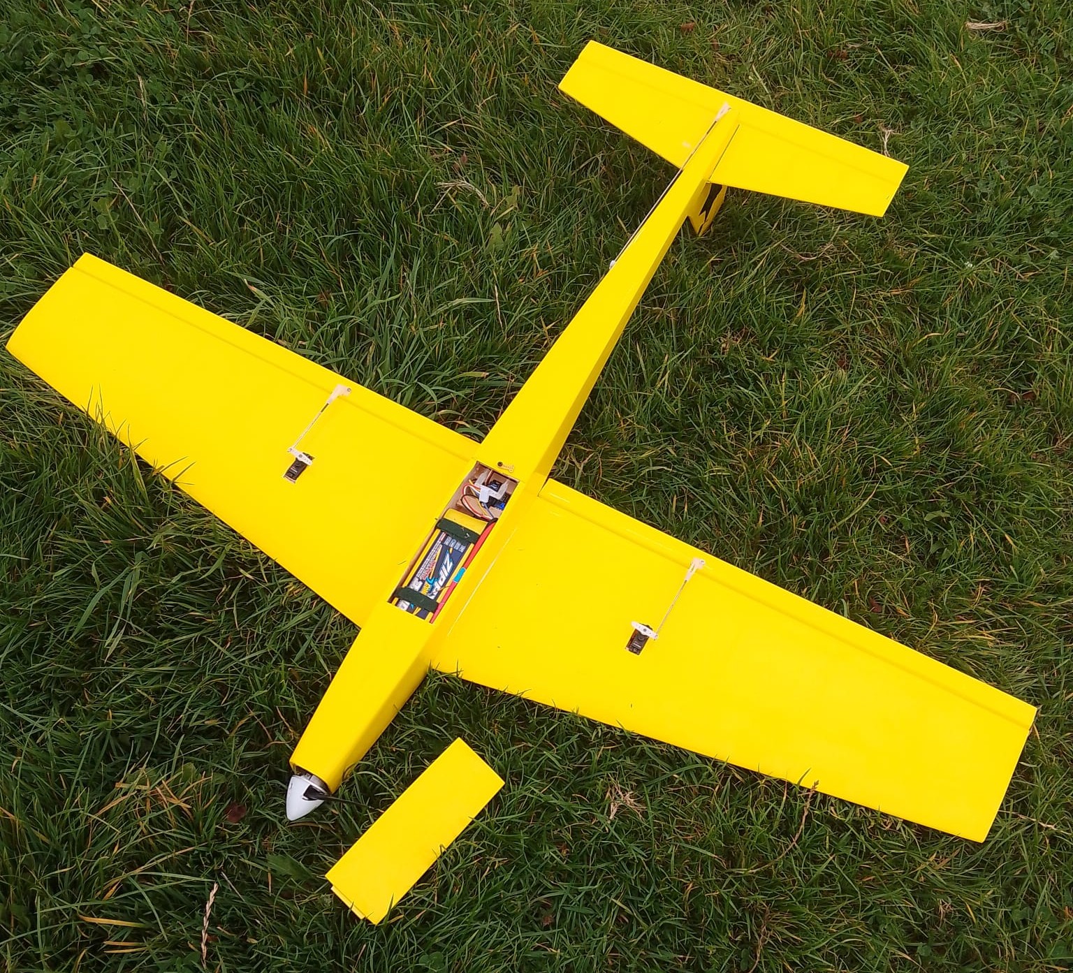 The wings were damaged beyond repair but the fuselage was too good to simply chuck in the bin so Bob modified it slightly and fitted the wings from a one metre span electric powered glider that he’d built during lockdown. He’s named the recycled combo TasLock.