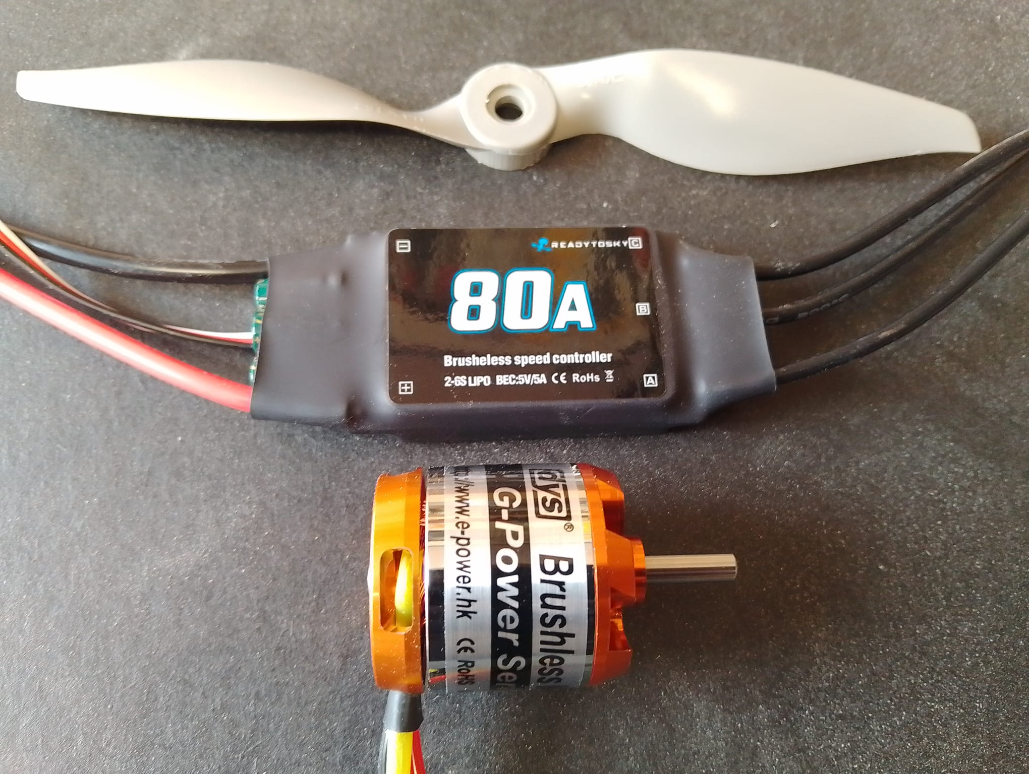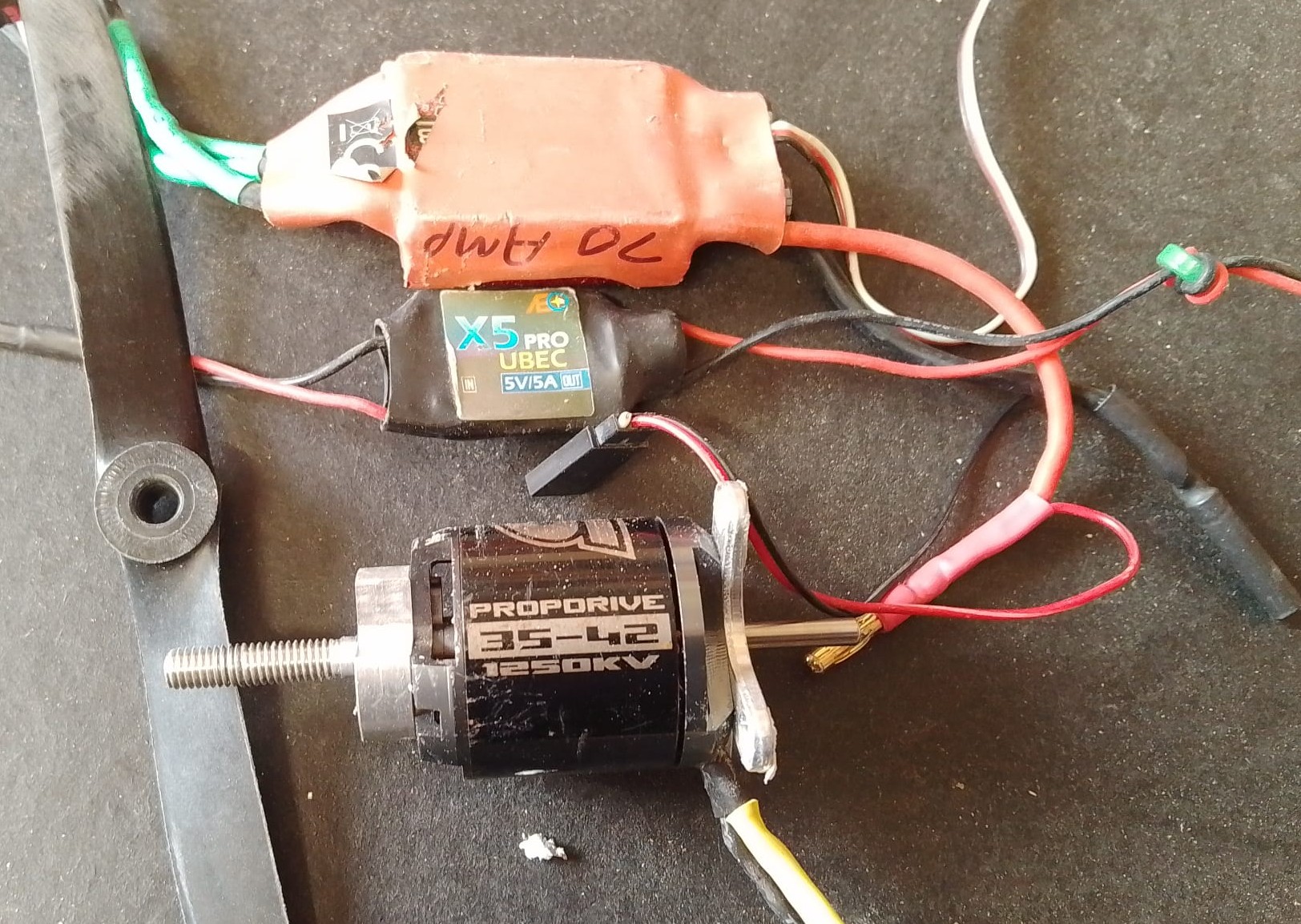 I fitted a 30A esc, a 1000kv motor and a 10×6 prop (now changed to a 9×6 prop).