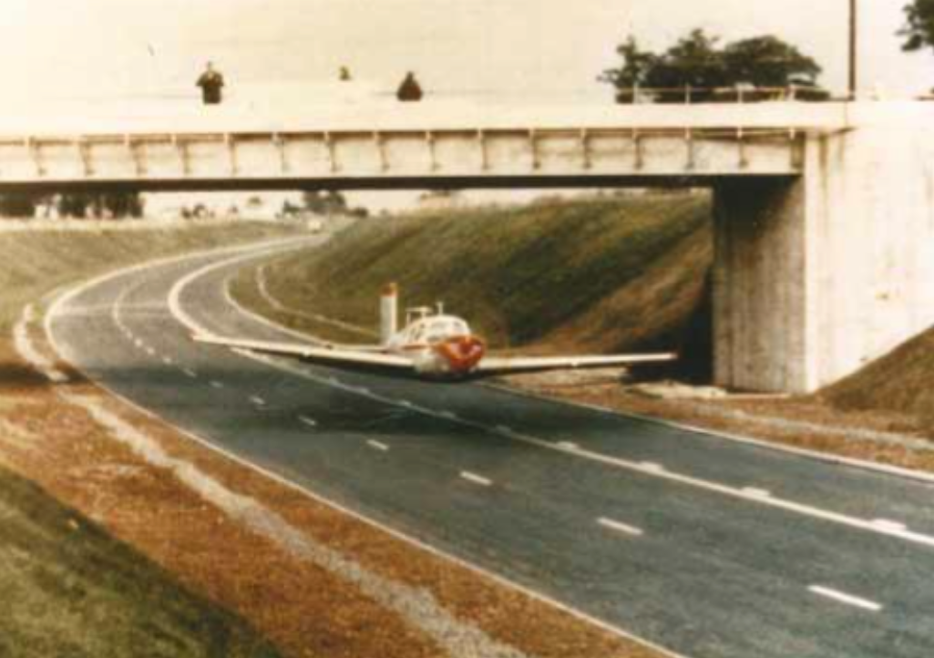 When I’m scouring the internet for information about models etc for Patch News I often stumble across other aviation items that might be of interest, and I tend to save them for quiet months when there hasn’t been a lot of flying to write about. One such snippet is about a chap called David Williams who lived close to a new by-pass that was being built around Hinstock, Shropshire in 1983. He saw a bridge had been built to carry Pixley Lane over the new by-pass and, after some careful measuring, decided to fly under it the day before the road was opened to traffic. His plane was a Saab 91D Safir, a four seat, single engined light aircraft that was built in Holland. The Swedish Air Force had used Saab 91s in the fifties and sixties and David’s had previously been used for radio equipment testing. David asked his dad stand on top of the bridge to take a photo (this was pre-digital days) but his dad was too quick on the shutter and missed the shot. Fortunately a friend was positioned further along the by-pass and he managed to successfully capture the moment.