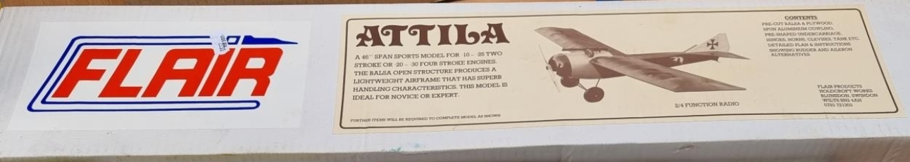 The Attila is a 46” (1168mm) sports scale model originally designed for small IC engines, either two or four stroke, but obviously 1066 has made his electric. Here’s what 1066 has to say about his journey to the Attila: Back in the mid-eighties I built a Flair Magnattila, it was fitted with a worn out Irvine 40 that barely had enough power to get it off the ground, but I loved it,  flying very slow low level aerobatics, it was so stable with no vices. A few years ago I had the privilege of flying Nick Squire’s late father’s Magnattila, probably the most emotional flight I’ve ever undertaken, but it was everything I remembered from my own model. Having recently fallen back in love with building I started looking for a Magnattila kit, but they are very rare, and when they do appear they are ridiculously expensive. Move to a Friday morning in late 2025 when John, Andy and I made the mistake of believing a weather forecast and tried to go flying. After about half an hour we realised the mist wasn’t going to lift so John invited us to his man cave for a coffee. While snooping around his cave I saw, what I originally thought was the sought after Magnattila, but turned out to be its’ smaller, almost identical brother, Attila. An offer was quickly made, and accepted, so I was now the owner of an Attila kit, for a great price. They say the nicest things come in small parcels; the Attila proves the point. Easy to transport with very forgiving flying characteristics, the Attila provides economical fun flying. The kit provides all materials for the 3-channel version but aileron conversion is detailed on the plan, so I decided to build mine with ailerons, using two small servos instead of the central servo with bellcranks as shown on the plan.
