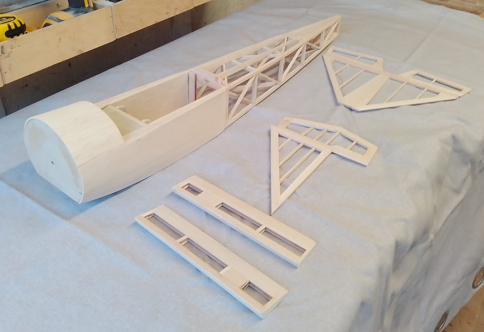Because the original was designed for IC, using a relatively large battery helps with CG, especially as I wanted to fit the Rudder and Elevator servos at the rear of the fuz. This type of model just has to be covered in fabric, and not film. Checking the internet for Antique Oracover I was shocked by the cost, to cover the Attila I calculated I would need about 2.75 metres, so would need two rolls at a total cost of £75, ouch, almost twice what I paid for the kit. However after further investigation I found a product being sold by Sarik Hobbies called Diacov 1000. The material is 10 cm wider than the normal hobby products, so I calculated that if I was careful I would only need 2 metres, which came too £ 29.00 delivered. The only drawback is that it only comes in translucent white. I watched a couple of YouTube videos demonstrating the product and it looked to be really good, so decided to try it, and I can confirm it is a great product for this type of model.
